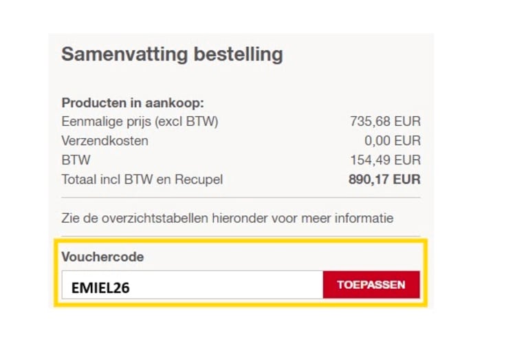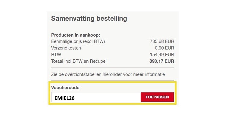 Bevestig je winkelwagen en kies een betaalmethode. In de samenvatting van de bestelling zie je een veld met de titel “Vouchercode”. Voeg de kortingscode EMIEL26 toe en klik op “toepassen”.