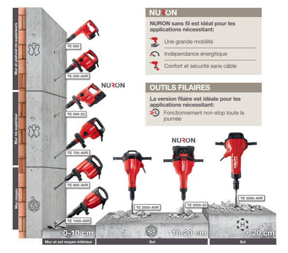 - Puissant burineur SDS Max (TE-Y) pour le burinage lourd dans le béton et la maçonnerie, équipé du système de réduction active des vibrations (AVR)